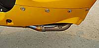 マイナーチェンジにて公表されている変更点は、 F.Iのマネージメント変更、サスセッティングの変更、バッテリーのMF化、エアクリーナー形状の変更など。 これらは名前を変えるほどのものではない。 そしてさほどコストのかかっている変更内容とは思えないが、定価が大きく変わった。 158万から178万へ、なんと20万もアップ。これは輸入元の説明によると、 内容の変更によるものではなく、為替変動によるもので、 もともとT595は現地の価格に比較すると日本の価格設定は安すぎたのだそうだ。 確かに日本車と違って凝った造りだったりするが、この説明にはいまひとつ納得しかねる。 更に、金額が上がったにもかかわらず、各部にコストダウンの跡が見られる。 まずはエキパイの造り。 スプリングによる結合から一体構造へ。 あきらかにコストダウン。 このエキパイは当然移植した。 |