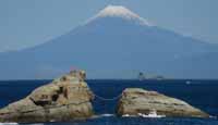 ここは密かな富士山撮影スポットかも。 左の岩の上には鳥居があって、左右の岩にはロープがかけられてます。 下に船があるの見えます? この岩意外とデカイんです。 |