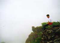 霧雨はやがて雨へと変わり、 急激に気温が下がってきた。 霧は濃霧となり、5m先も見えない。 もともとこんなに歩くつもりは無かったから 水も携帯食もない。 行きは「この先何があるんだろう」ってワクワクしながら調子に乗ってどんどん下山してしまったが、果たして頂上までどのくらいあるんだ? 寒い。 ものすごく寒い。 空腹以上に喉が乾いて我慢ができなくなってきた。 高山植物になっている実をむしって口に放り込み、わずかに出てくる水分で喉を潤す。 体力は限界。 疲れ過ぎて歩けない。 3分歩いては5分休む。高山植物の影に寝そべって風をしのぐ。 座り込んだ途端に猛烈な睡魔に襲われる。 |
